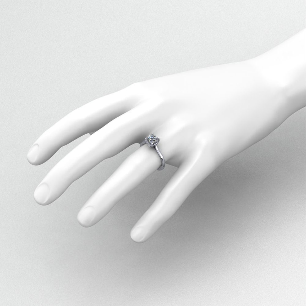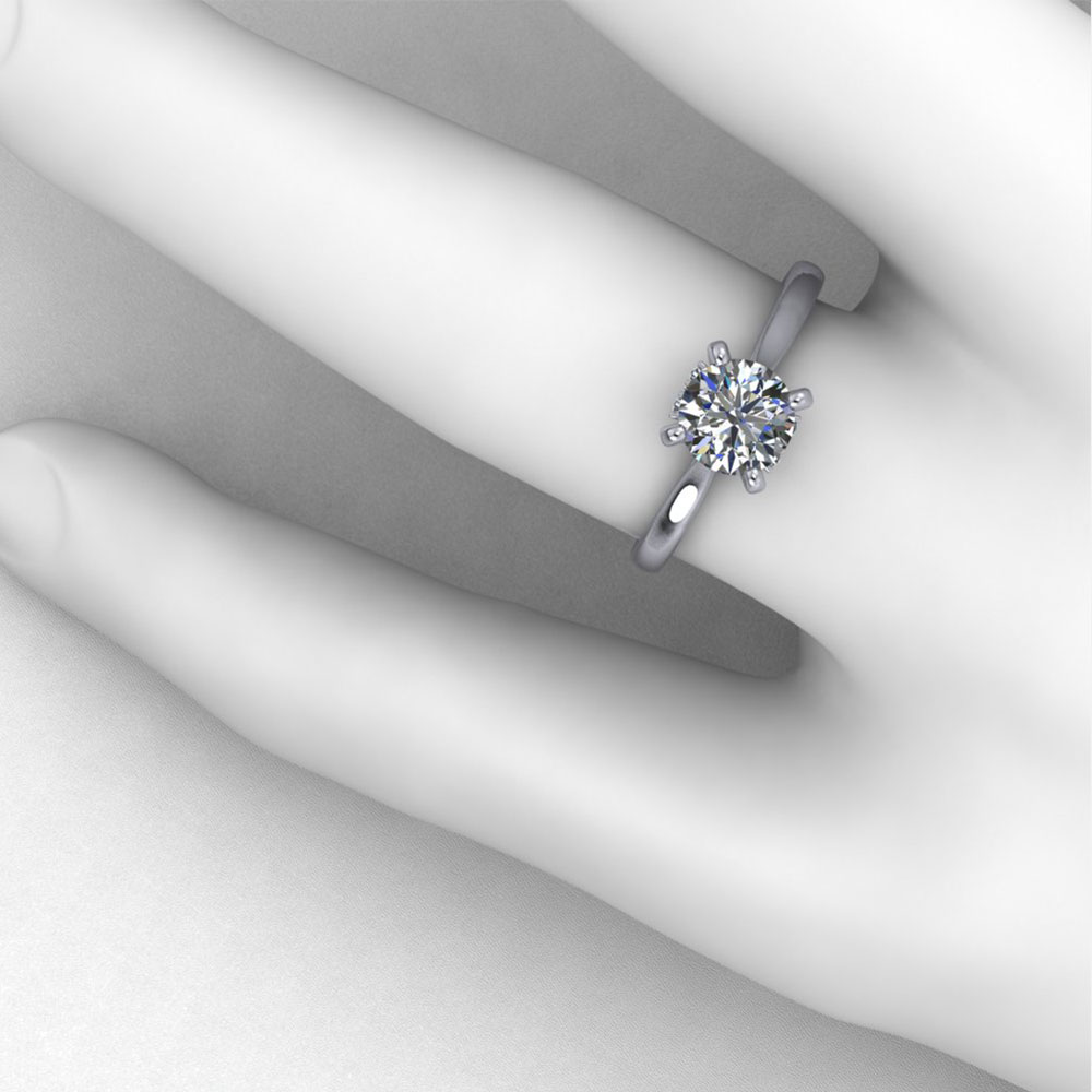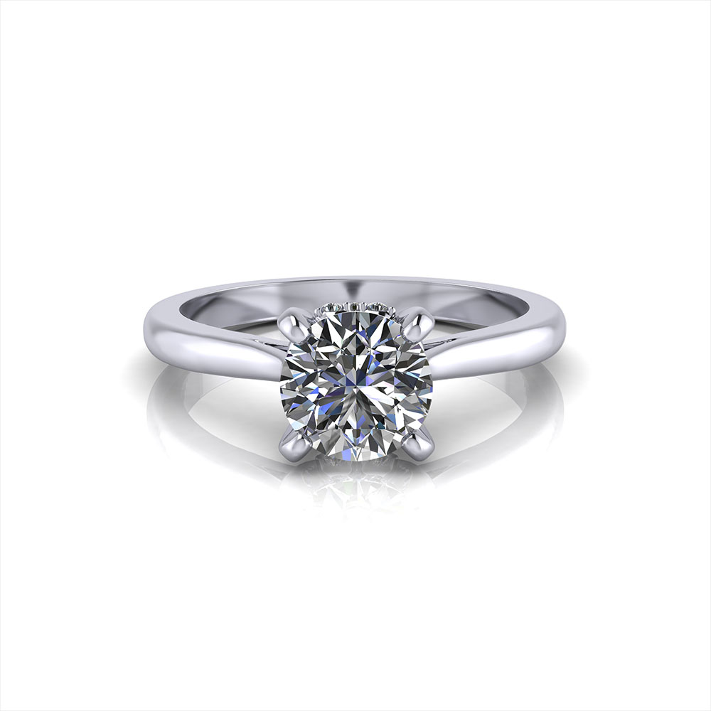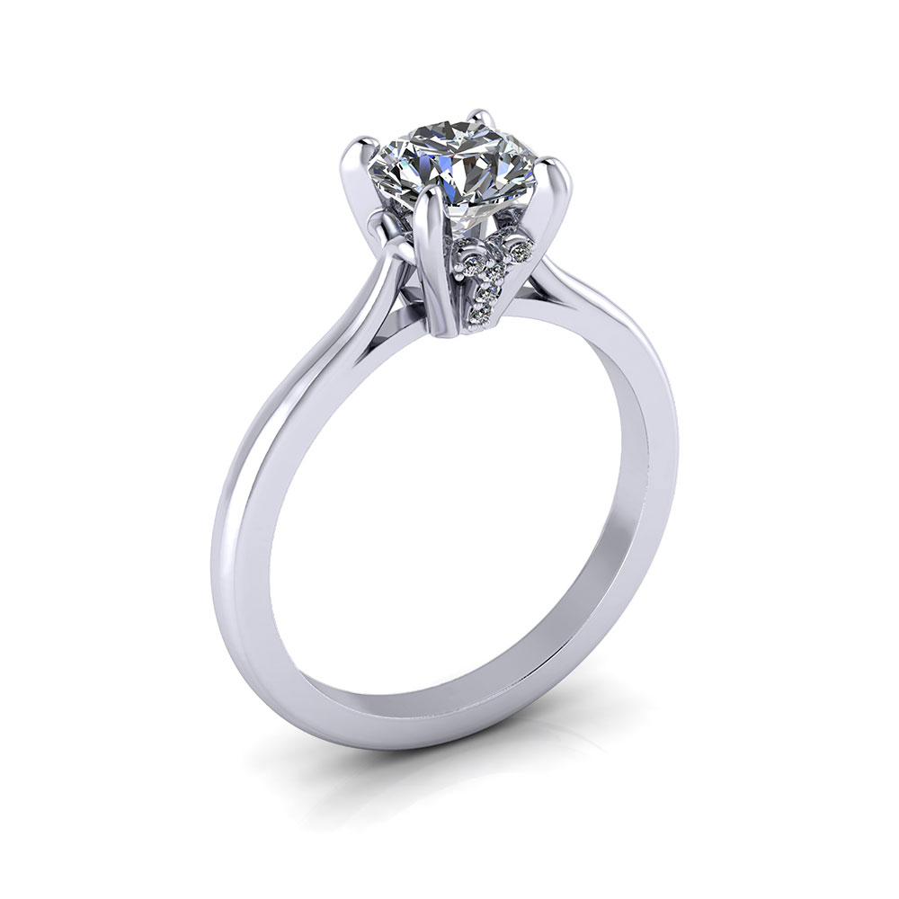 This Accented 4 Prong Engagement Ring features dashes of fine diamond detail. Beautifully understated. the 4 prong setting is articulated with .05 cttw of bead set diamonds sparkling beneath a 1 carat round center. Created from 18k white gold. fine diamond rings such as this are made in America by the skilled craftsmen at Jewelry Designs.